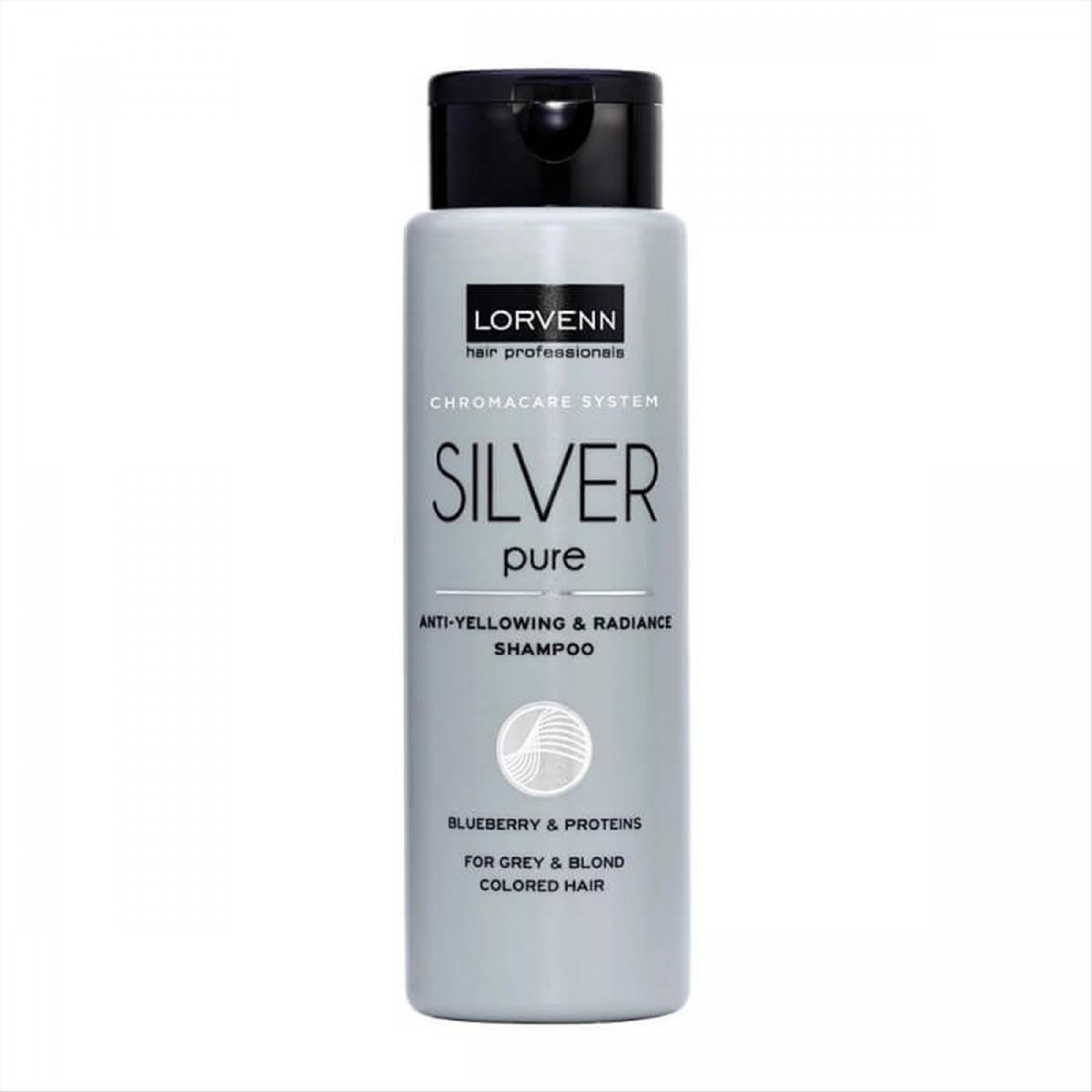 Lorvenn Silver Pure е специализиран шампоан против пожълтяване, предназначен за сива, руса или коса с кичури. Продуктът съдържа система за неутрализиране на нежеланите жълти оттенъци с нежна формула и антиоксидантно действие. Обогатен е с екстракти от боровинки и специални протеини, които съживяват косата за защита на цвета, естествен блясък и здравословен вид. Танините от боровинките помагат за свързване на цвета вътре в косъма, осигурявайки по-дълготрайност и сияние на боядисаната коса. Млечният протеин в състава хидратира и омекотява косъма. Подходящ за сива, руса боядисана коса или коса с кичури.