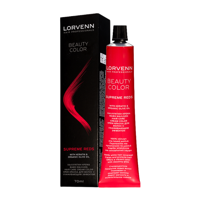 Beauty Color Supreme Reds от Lorvenn е професионална боя за коса в червени нюанси, вариращи от студено виолетово до топъл бронз. Това е смело решение за боядисване, което никога не остава незабелязано. Боята покрива перфектно, естествено и ефективно дори най-трудните за боядисване сиви коси. Придава на косата ярък, естествен цвят, който се запазва дълготрайно. Изсветлява естествената коса с два до три тона. Прави косата податлива на обработка, блестяща и копринено мека.