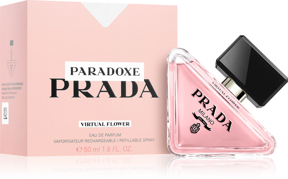 Елегантният и минималистичен флакон, в който се крие ароматът Prada Paradoxe Virtual Flower, възхвалява противоположностите. Триъгълната форма, вдъхновена от емблематичното лого на Prada, лежи провокативно отстрани и привлича вниманието със своята оригиналност. Нежнорозовият нюанс на парфюмната вода създава драматичен контраст с черния надпис, като подчертава перфектно нейния флорален характер.